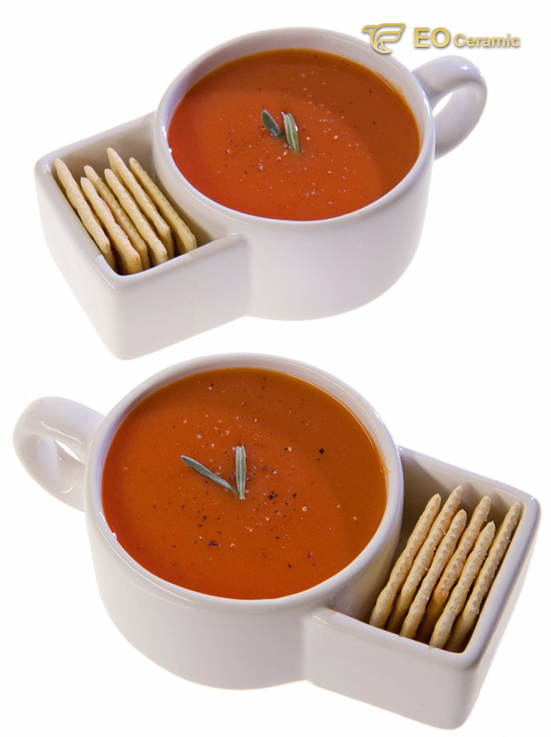 Ceramic soup mug with cracker place appearance, detail design, some information you must know. Simple and plump lines, beautiful and meticulous silhouette. Clear lines,smooth and delicate edges.